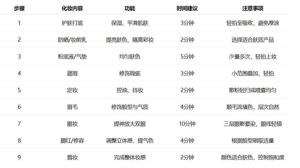 下表整理了新手化妆步骤、顺序和时间建议,方便参考:
