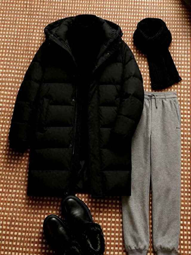 黑白灰不是不能穿,但得让材质有对比。黑羽绒选哑光面料,内搭浅灰粗针织,围巾用奶油白羊绒毛,三种灰度一搭,光线打上去有深浅感,人立刻显瘦。