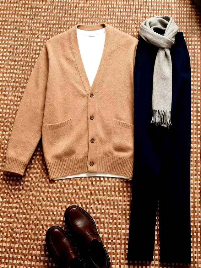 深灰毛呢大衣配浅卡其裤,通勤最轻松。大衣选含8%羊绒的,挺括不压身,裤子九分露踝,袜子选深灰羊毛,和外套呼应,鞋子是黑色乐福,一整身像投行周五便装,老板也觉得你稳重。
