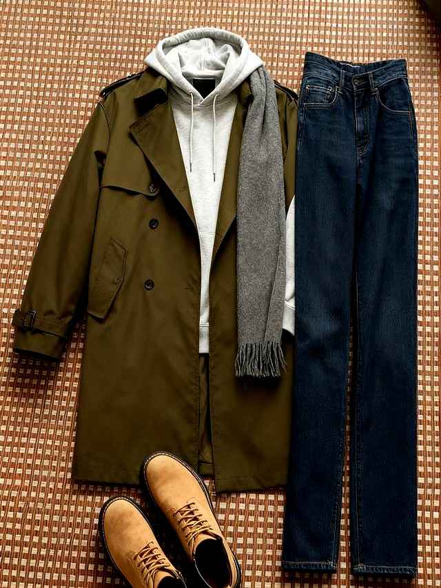 军绿风衣别配运动鞋,否则像要去爬山。里面叠一件灰卫衣,领口露出白色T恤边,下装深蓝牛仔,鞋子选黑色厚底德比,城市户外切换无违和。风衣长度不过膝,165cm也能穿出175cm的效果。