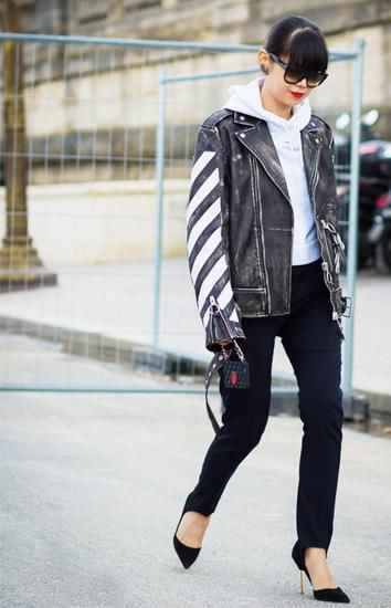 想要更年轻、更有活力一点?那你一定要试试“夹克+连帽卫衣”这个王炸组合-1。一件硬挺的黑色皮质夹克,里面叠穿一件柔软的深灰色连帽卫衣,帽子自然地翻出来堆在颈后-1。这种一硬一软、一挺一柔的碰撞,特别有层次,而且减龄效果满分,瞬间回到校园时代-1。怕冷的话,这露出的帽子还能帮你挡挡风,实用又好看-1。