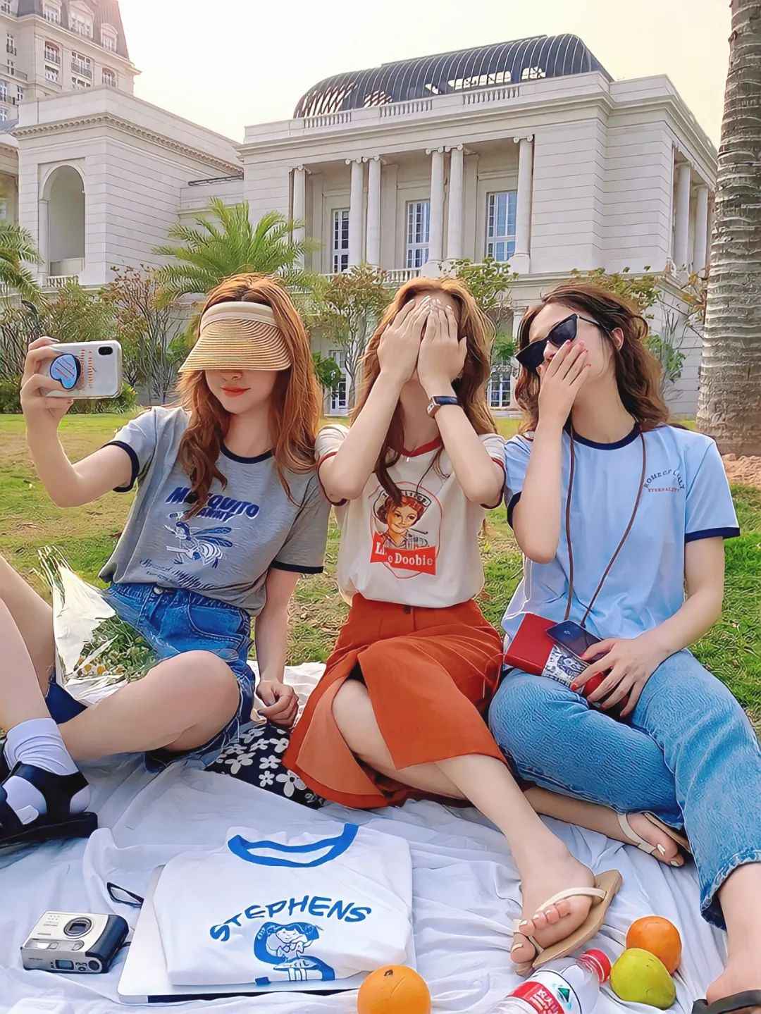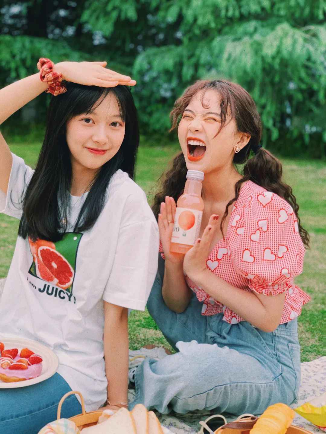和闺蜜野餐,颜值相当就看穿衣。记住,亮色上衣是制胜法宝!
