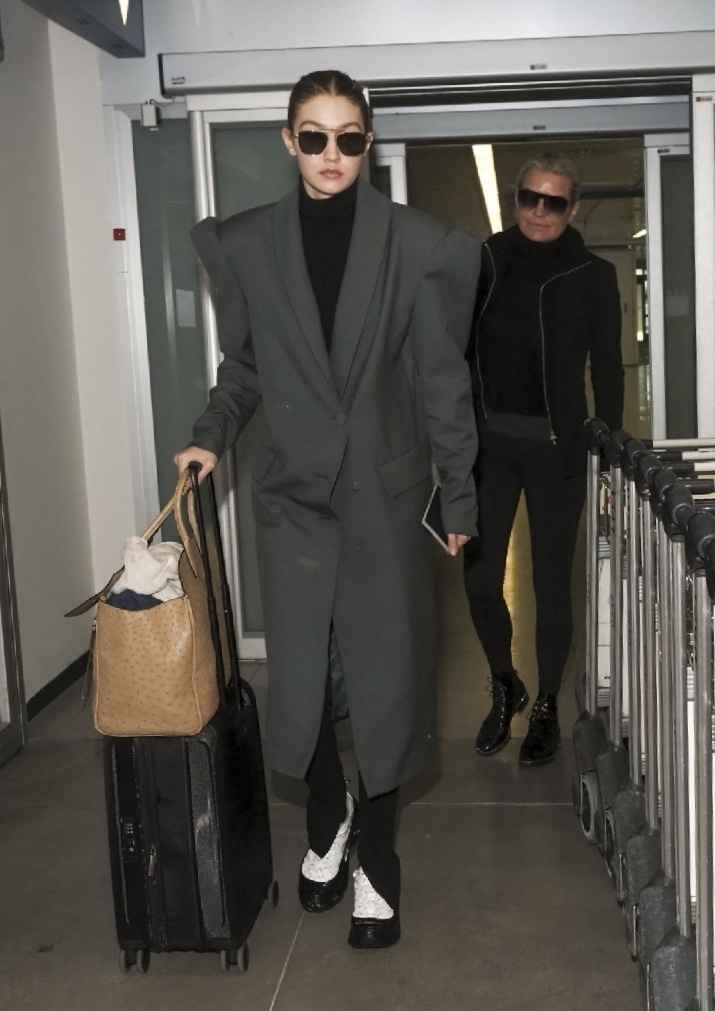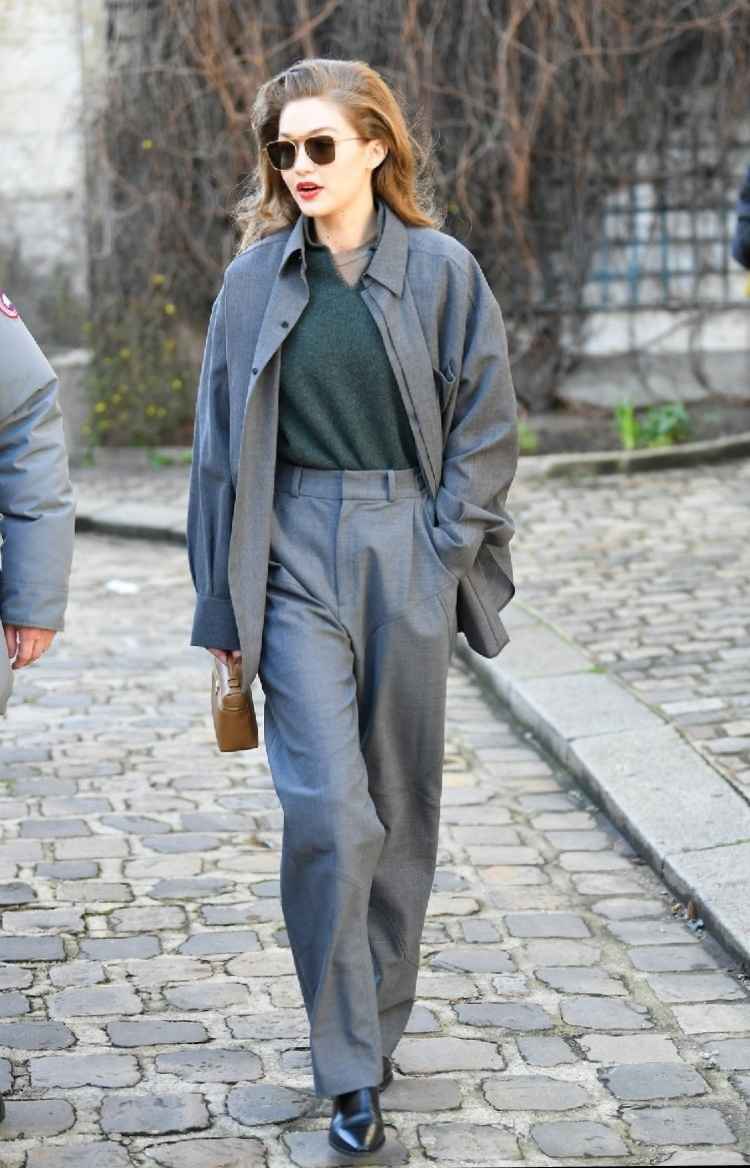 Gigi穿了一身灰色长款西装外套,超宽垫肩设计展现出大女人气场,造型充满设计感。V领露出里面的黑色高领毛衣,黑灰搭配更显高级。她佩戴Amavii品牌的黑色墨镜,瞬间提升整体气场。