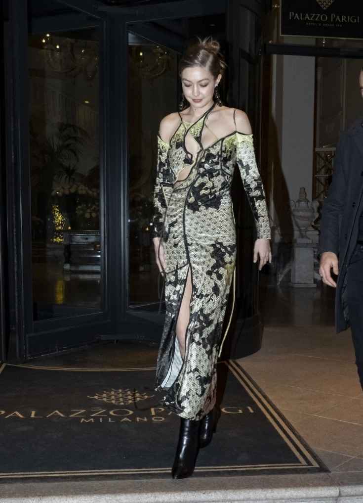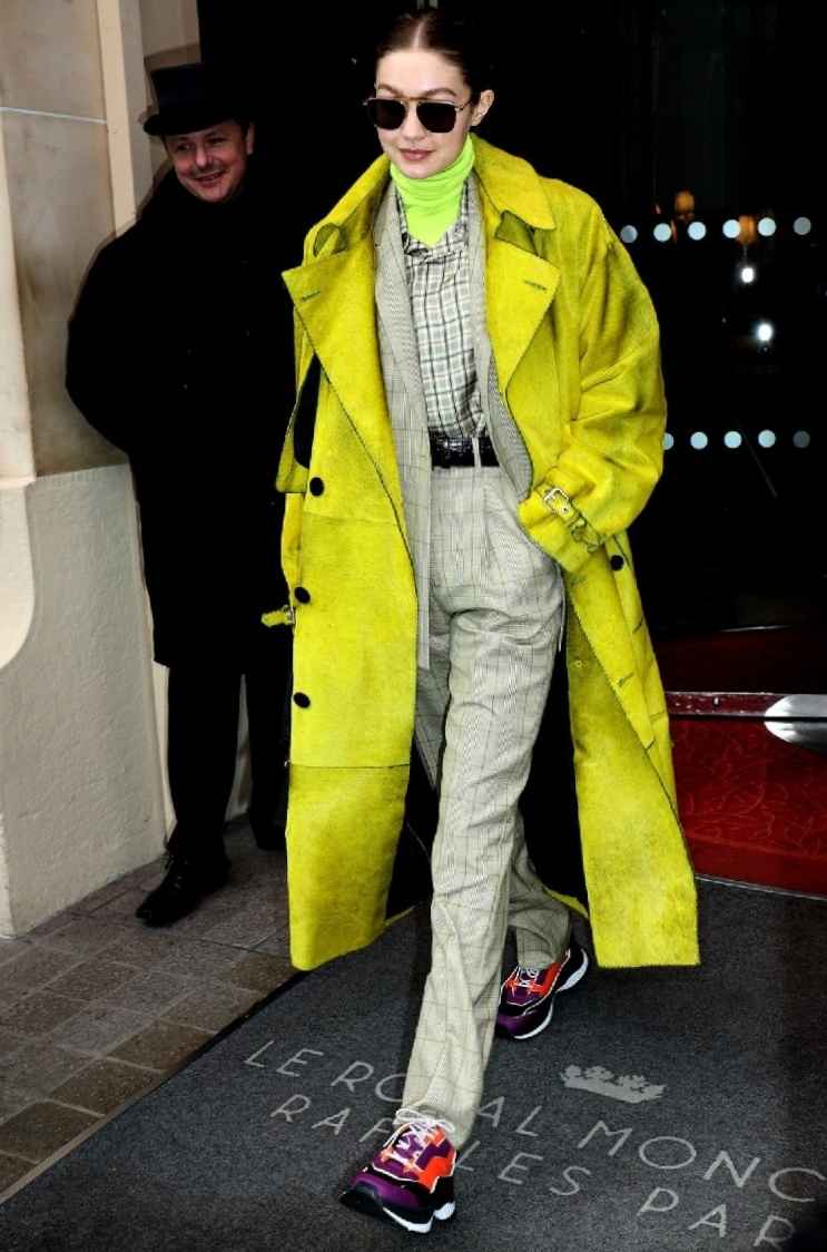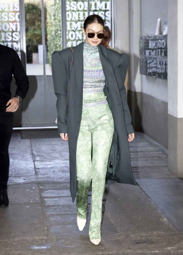 Gigi身穿Annakiki品牌的灰色大垫肩长款外套,帅气又酷感十足。内搭Versace印花套装,鲜绿色印花与沉色外套碰撞出清新感,修身长裤凸显大长腿,再配白色高跟鞋,气场全开。