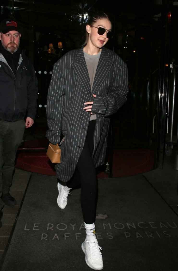 Gigi穿黑色条纹oversized外套,经典黑白条纹,宽松款式显瘦。内搭灰色圆领T恤,下身配黑色袜裤和白色运动鞋,白色高筒袜抢眼。