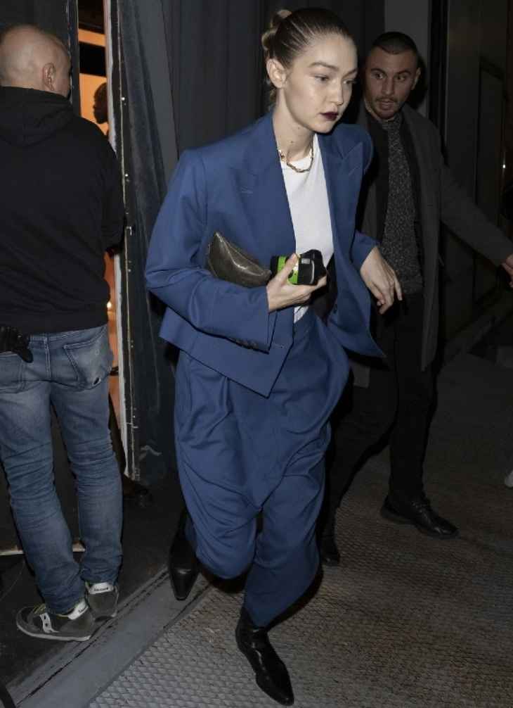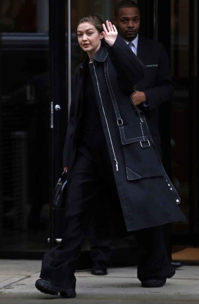 Gigi在时装周上穿了一件Hermes蓝色大衣,深蓝色调低调又高级,大衣设计有超大口袋,点缀银色金属元素,时尚又新颖。她搭配黑色长款阔腿裤和运动鞋,造型酷炫潮流,尽显超模风范。