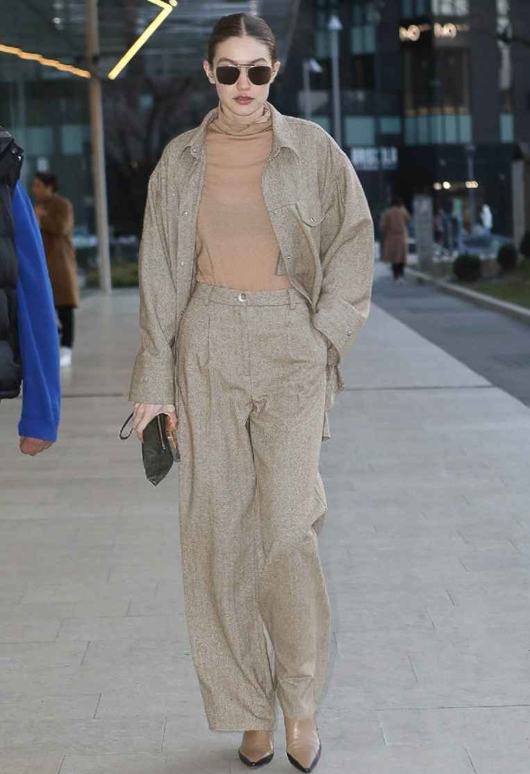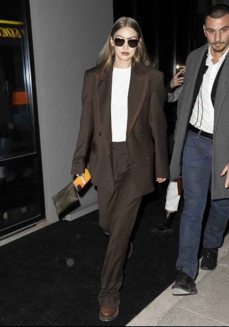 赶往米兰秀场时,Gigi换上一套棕色西装套装,深色易显成熟,内搭白色T恤增加清爽感。下身阔腿裤配圆头皮鞋,造型时尚。