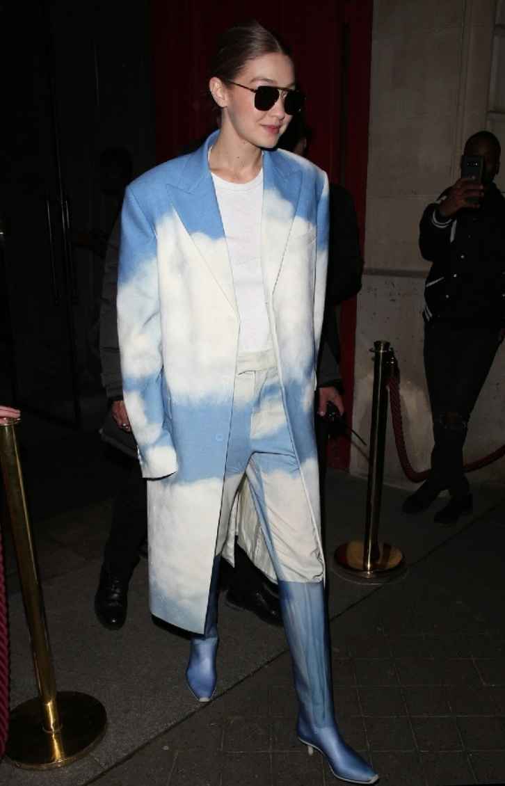 离开巴黎时装周时,Gigi穿Louis Vuitton男生套装,天空蓝配色清新,内搭白色T恤,颜色和谐。脚踩Off-White蓝色长靴,与套装意外搭配。