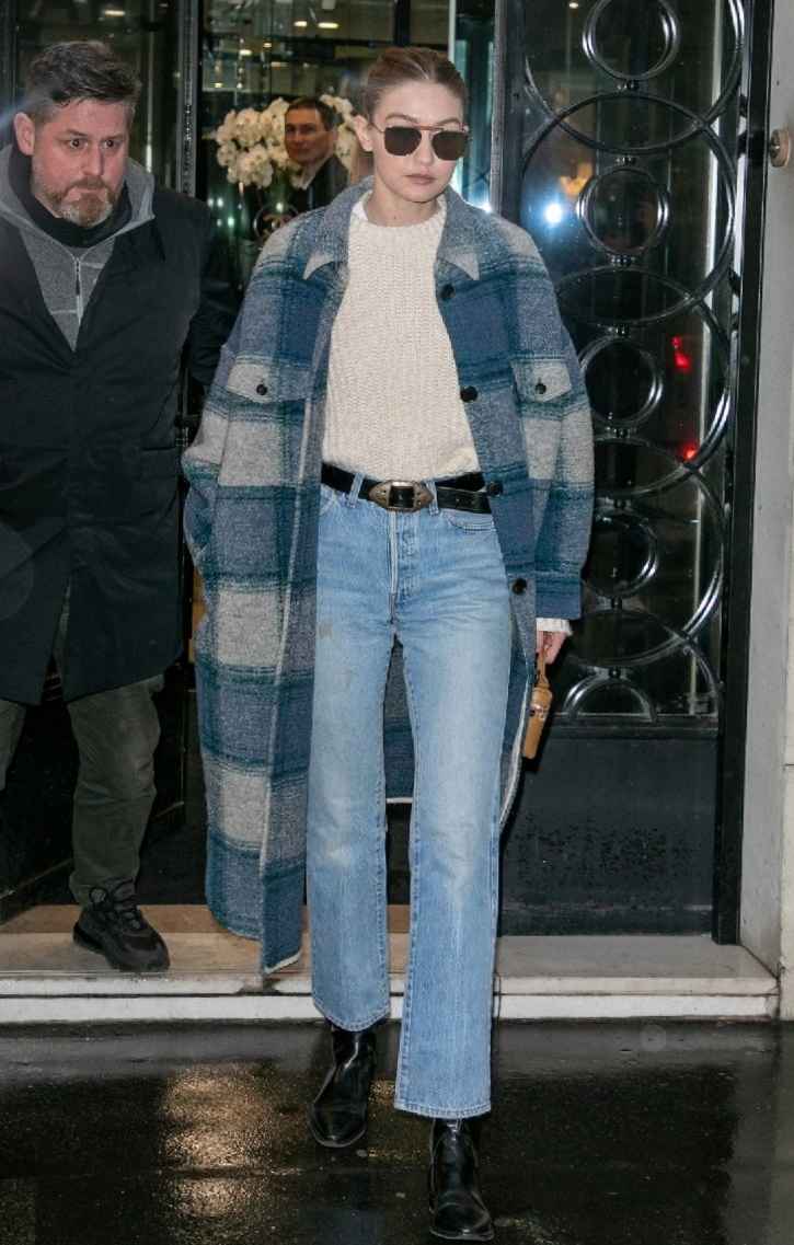 Gigi钟爱oversized款式,穿蓝色格子大衣,蓝灰格子复古优雅。内搭白色圆领毛衣,下身配牛仔长裤,黑色皮带和黑色短靴,造型舒适。