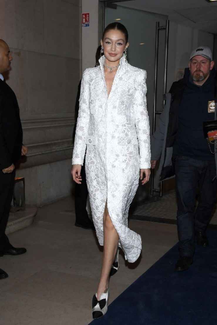 这身白色裙子高级迷人,是Gigi参加Chanel高定展览开幕式的造型。白色裙子上有精细花纹纹路,质感十足,立领配V领显脖子修长。裙子下摆开衩小性感,脚踩尖头高跟鞋,黑色小蝴蝶结装饰,时尚又俏皮。