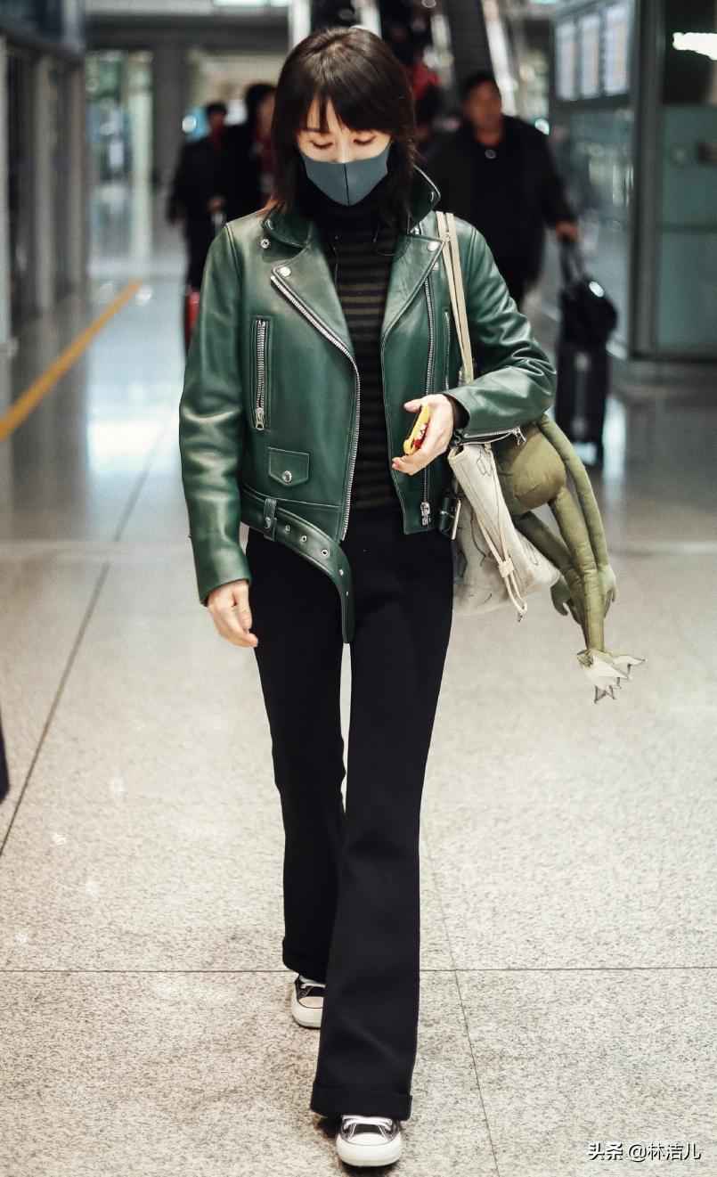 比如这身绿色皮衣内搭条纹针织,酷劲十足,下身黑色微喇裤演绎复古风。