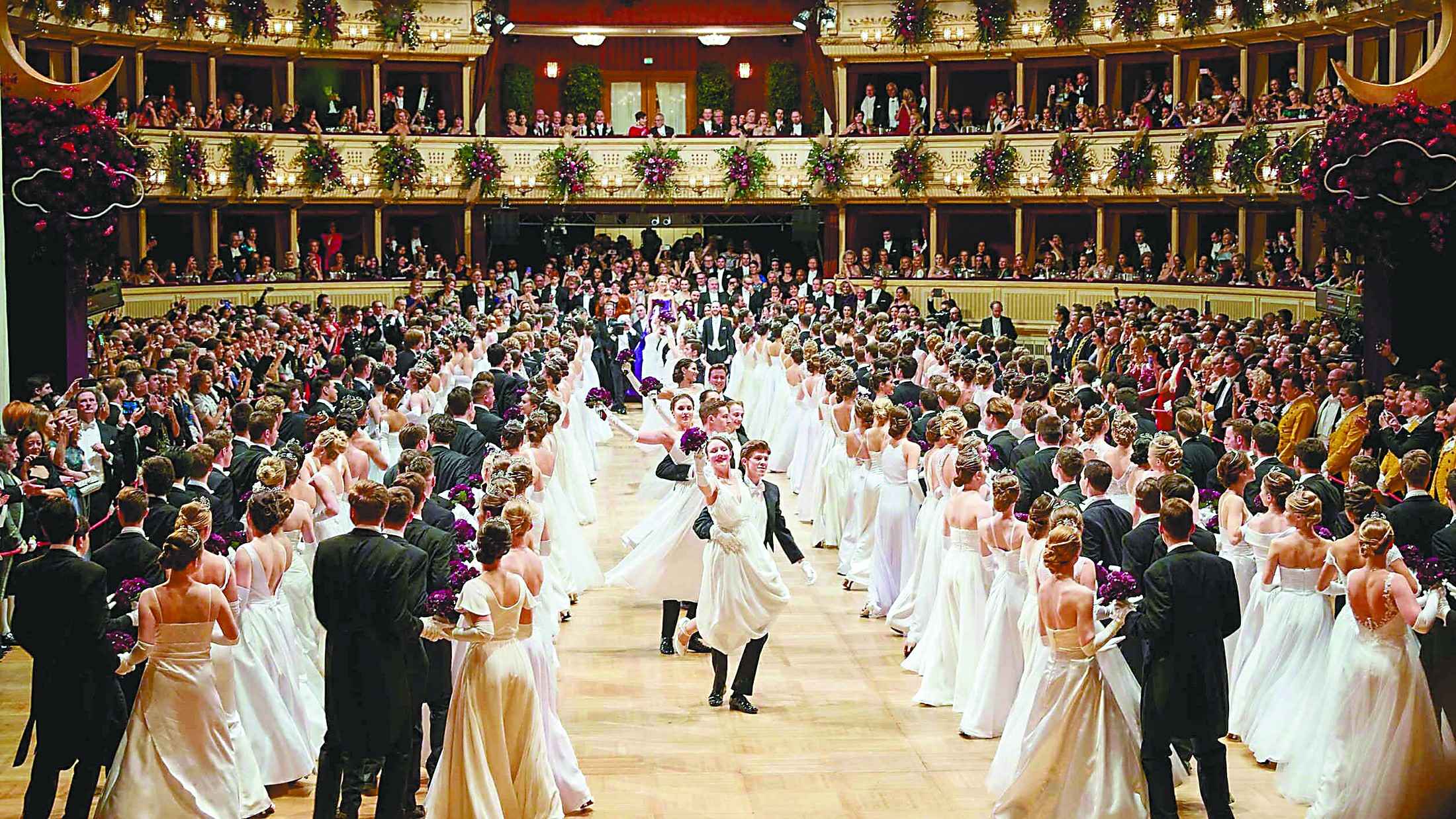 维也纳的各大舞会对穿着有严格规定:男士必须穿燕尾服,普通舞会有时也接受黑色西装;女士则需身着晚礼服,裙摆越长越显隆重;初次参加舞会的年轻女士要穿白纱裙、戴王冠、持花束,象征成人礼。每位女士入场时都会收到一份精心准备的礼物。舞会流程正式有序:开场仪式由年轻男女表演传统四对方舞,相当于他们的“成人礼”;开场舞后,主持人高呼“大家都来跳华尔兹吧”,来宾们便涌入舞池翩翩起舞;午夜时分,所有人一起参与“午夜插曲”环节。