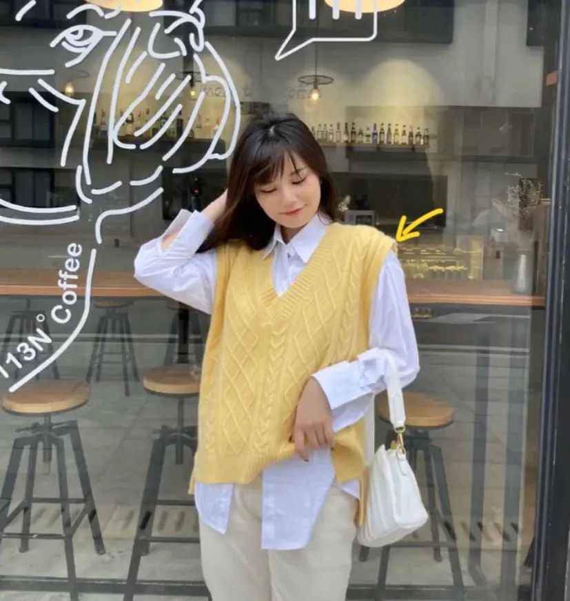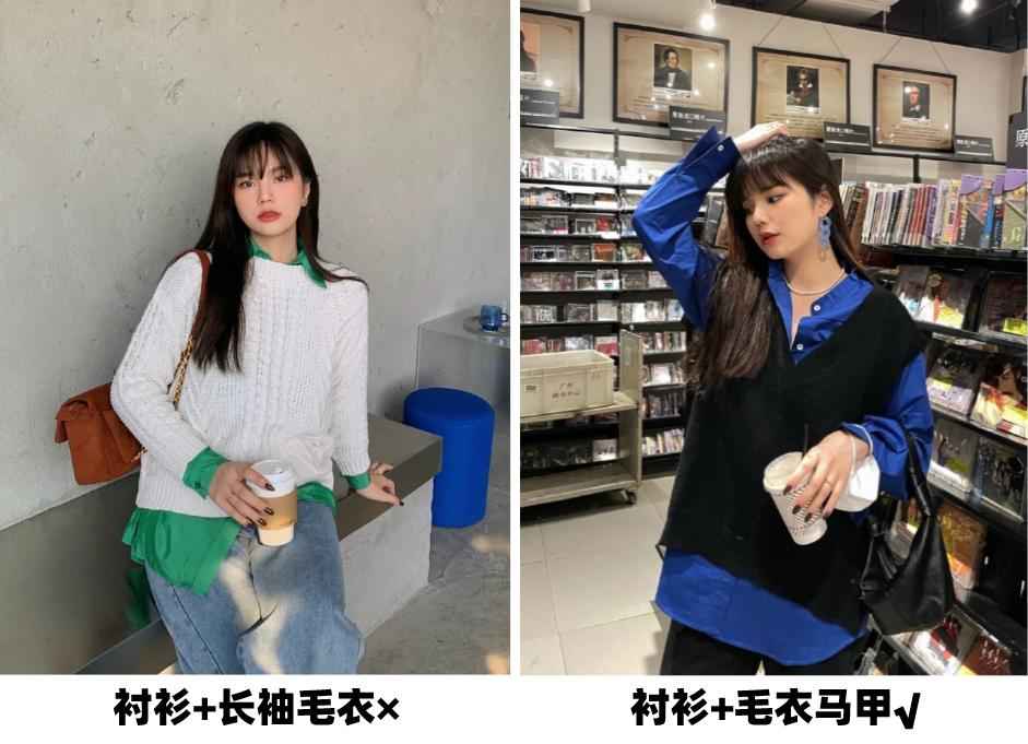 比如经典的衬衫+毛衣搭配,选择无袖马甲款会比长袖更显瘦,马甲和袖子的色块区分开,整个人看起来纵向拉伸,自然就瘦了。