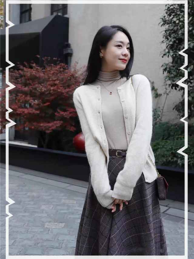 修身短打底加针织开衫,衣长过臀,避开短上衣显胯宽的雷区,下搭格子毛呢伞裙,复古优雅。腰带勒出细腰,塑出S曲线。选毛呢、棉麻面料更垂顺,避开蓬松纱裙。
