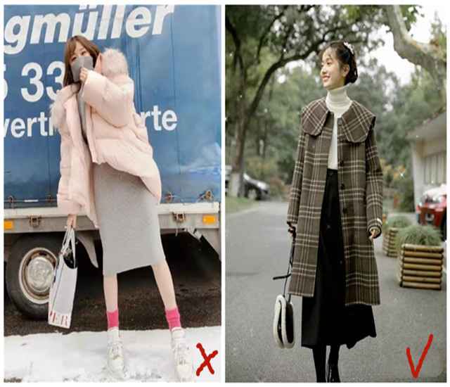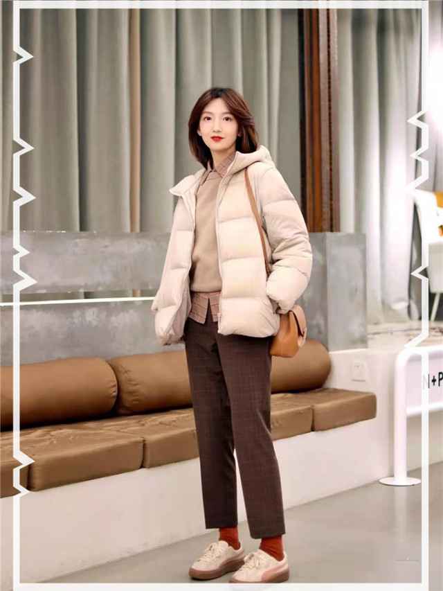 胯宽姐妹通常小腿细,搭条挺括格子西装裤,外披长羽绒服,衣长遮臀超显瘦。选黑、灰等深色更收缩视觉。小个子挑中长款,盖住屁股就行。