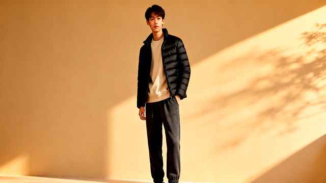 第二套方案走简约路线:黑色短款羽绒服配浅米色卫衣,下身搭深灰束脚裤。核心在于“短款+修身”。黑色羽绒服能收缩整体线条,不给身高拖后腿。这可不是偷懒,而是真正理解服装的功能。深色束脚裤减少腿部膨胀感,浅色卫衣打破沉闷,短款设计在视觉上缩短上身,让腿看起来更长。鞋子选黑色统一色调,让线条从脚部自然延伸,形成纵向拉伸感。