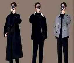 新增第九套灰蓝毛呢大衣搭配黑色高领和深灰西裤,适合职场男生,穿起来稳重又帅气,面试或约会都能加分。