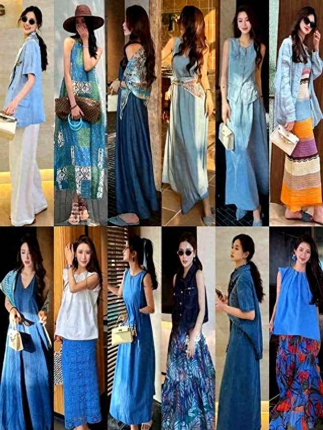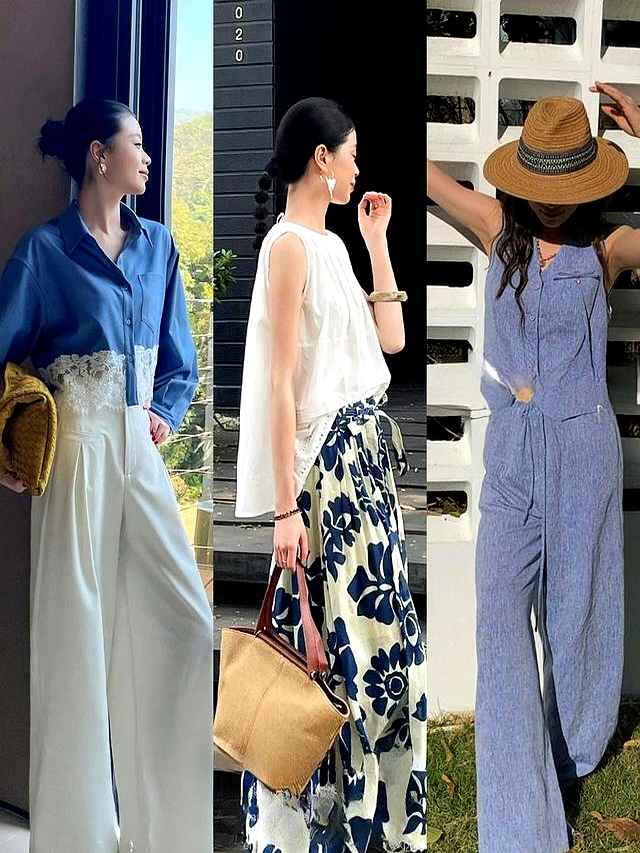 蓝色系也不甘落后。挂脖蓝色印花上衣配牛仔阔腿裤,度假风满满。红色包包亮眼如水果,草帽让阳光变温柔。灰色V领雪纺裙搭浅蓝色,清爽降温,随时能去聚会。杭州女孩的审美就是随性高级,看起来轻松,但穿起来超美。